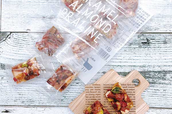 「キャラメル アーモンド プラリネ」は、この伝統的な製法を用いて、アーモンドとピスタチオをベースに、風味豊かなココナッツと酸味が香るクランベリーをキャラメリゼした、自然の恵みが贅沢に詰まったプラリネ。