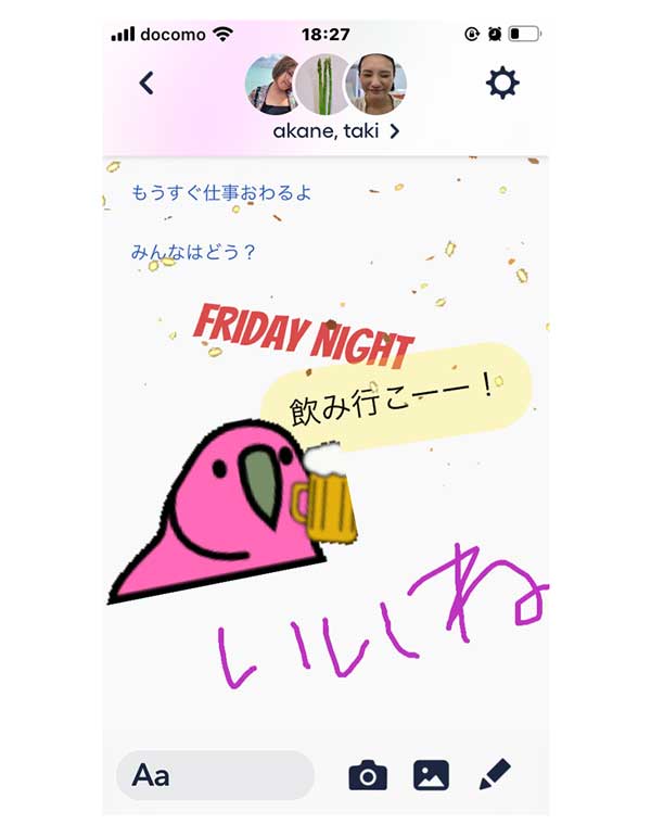 英数字のフォントは42種類、手書きの文字、写真や画像、GIFアニメなど、見た目を自由自在に変えられるチャットが推し。好きなところに好きなスタンプや文字を入力できる。すなわち、人の送ったものを上からかぶせることもできるし、消すこともできるんです。