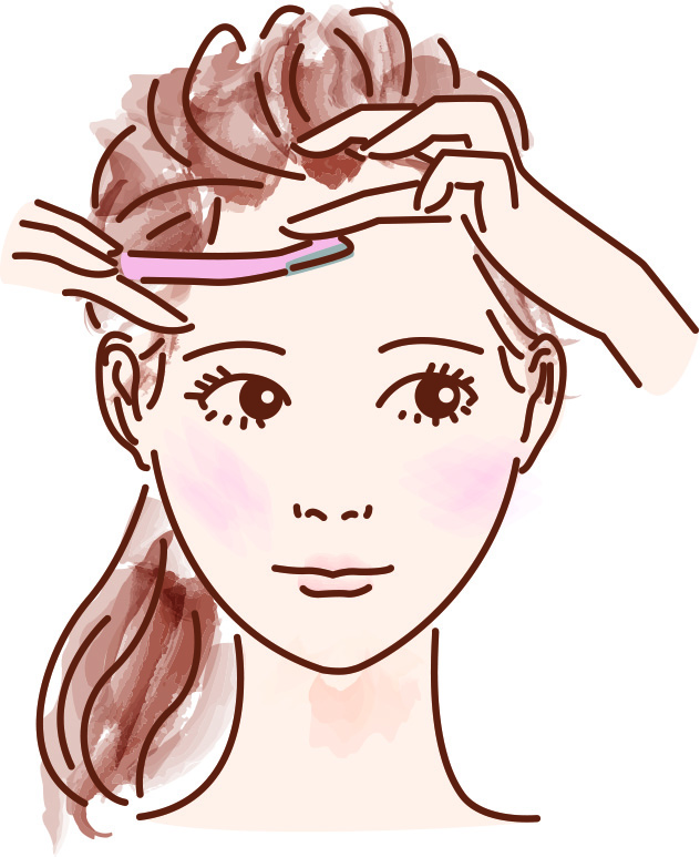 まず髪の生え際を1cmほど残して額の輪郭を剃り、そこから眉に向かって下に剃っていきます。この時、眉の上も1cmほど残しましょう。さらに眉の下側も上から下に向かって剃ります。