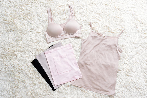 シルク腹巻(シルク95% ポリウレタン5% カラー/ピンク・ブラック・サンドベージュ)3,024 円、シルク100%キャミソール(シルク100% カラー/オフホワイト・ブラック・モカ) 4,104 円。他、「シルク100%モールドカップブラ」4,320 円もラインナップ。