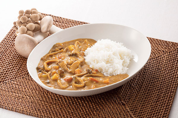 粉砕したエノキタケを煮詰めて凍らせた「えのき氷」を溶け込ませたカレーソースは、エノキタケの旨味や栄養成分が凝縮されているだけでなく、「キノコキトサン」によって脂肪や老廃物を体外に排出する効果も期待できるうれしい一品。