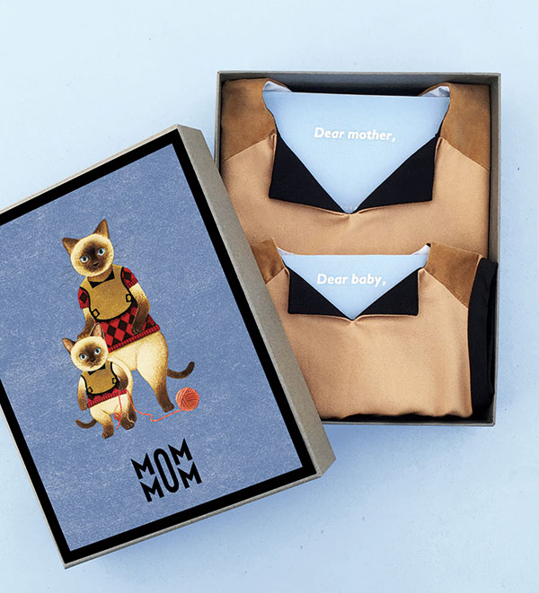 仲良し親子の動物イラストが描かれた可愛い化粧箱入りで、出産祝いや子育てママへのギフトにおすすめの「親子スタイ」。