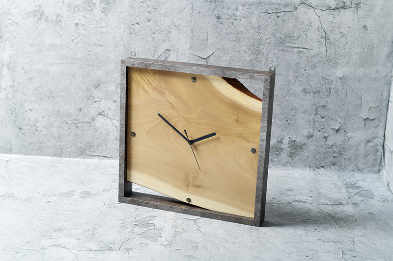 クリーム緑色の空間に陽が差し込んでいるような木目が特徴的な国産のホオ(ホオノキ)を石目調のフレームに落とし込んだ、シンプルながらも目を惹く秀逸なデザイン。