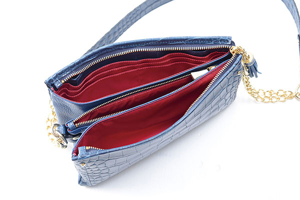 内側の革は丈夫な牛革を使用し、内装は汚れがつきにくいポリエステルを使用しているのもポイント。ファスナーや取り外しの多い丸カン金具についても、サイズ感やメッキのはがれにくさなど、細部にまでこだわってセレクトしています。