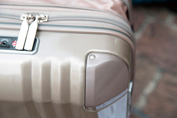 また前輪のストッパーはスーツケースの側面に配置されているのでしゃがまずに操作ができるだけでなく、コーナーパッド付きで衝撃に強いボディへと変身。エレガントさとタフさを兼ね備えた最強スーツケースです。