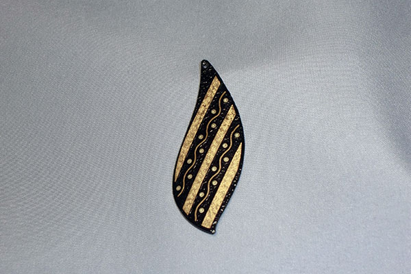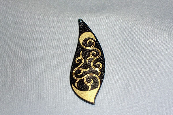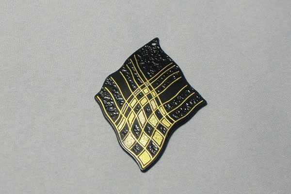 その古来からの伝統技術に、鉄生地の表面に凹凸をつける独自の技法「梨地風地模様」を融合させた「京象嵌小野」の1点モノのアクセサリー。光の反射によって煌めく優美な逸品です。