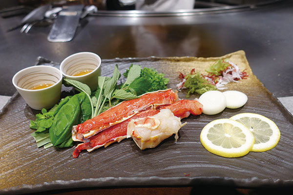 大きな「たらば蟹」はたっぷりの香草やレモンと蒸し焼きに。