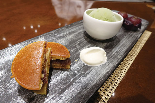 「ガーリックライス」でまったり、そしてお楽しみのデザートは、なんと目の前で焼いていただける「どらやき」。