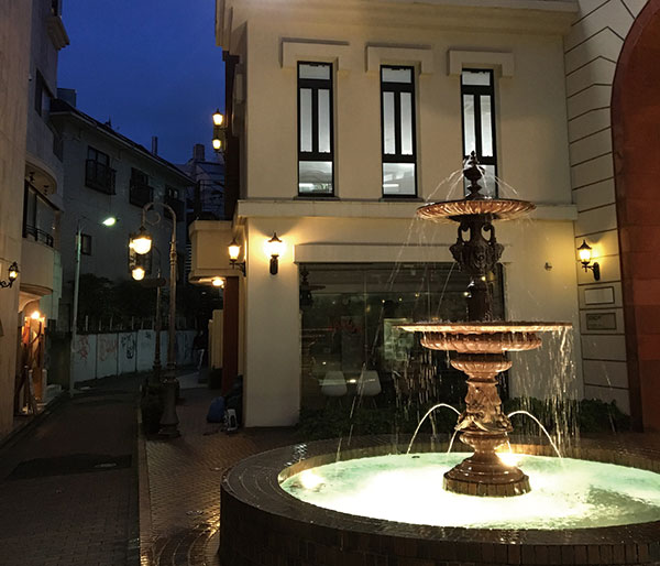 夜になると噴水がライトアップされ、異国を訪ねたような気分にしてくれる。