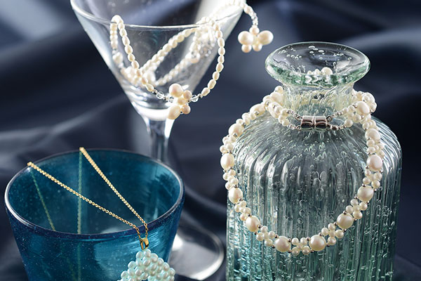 厳選したボタンパールと大きさの違う真円の淡水パールが襟元に美しい弧を描く「ボタンパールネックレス」や、色の違う淡水パールを組み合わせた「バタフライネックレス」など、高品質の淡水パールを使った上品なデザインが人気です。