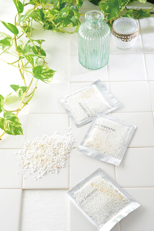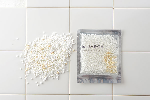 そんな、疲れやストレスをリセットするために開発されたのが「for EMPATH リセッティングバスソルト」。人や物のエネルギーに敏感な人向けに、昔ながらの手法によって手作業で造られた天然塩と、200kgの月桃から80ml程度しか抽出できない希少な月桃精油のみで作られたバスソルトです。