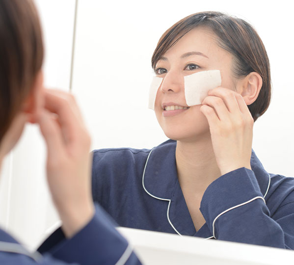化粧水をコットンを使って入れ込むと毛穴が引き締まり美容液なども効果的に使用できます。