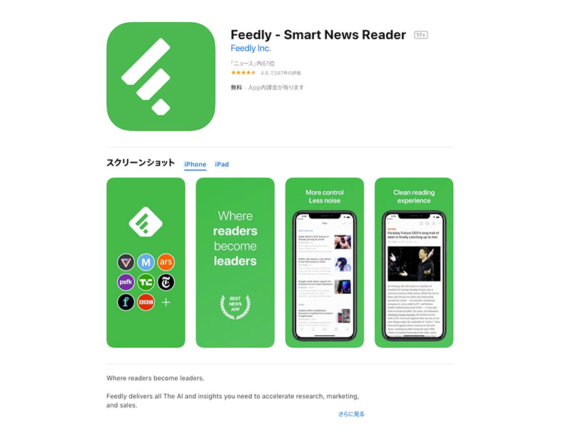 『Feedly』は登録したWebサイトやWebメディアの更新された情報をRSSで集めてくれるアプリです。