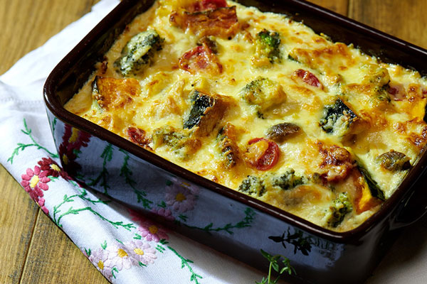 3 グラタン皿に茹でたマカロニを入れ、かぼちゃ、ブロッコリー、ミニトマト、1の玉ねぎとブナシメジを適当にのせ2をかける。