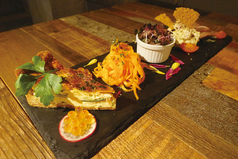 鮮やかな前菜からお食事開始、“季節のキッシュ”や“砂肝のコンフィなど”5種類が盛り合わせになっています。