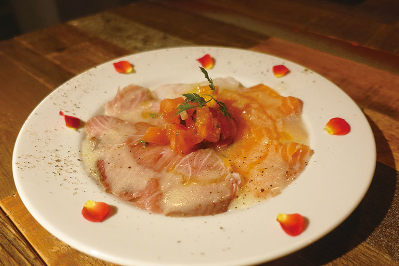 カルパッチョは旬のお魚3種類を使用、この日はブリ・スズキ・サーモンと、新鮮なお魚をとても可愛らしく飾ってあります。