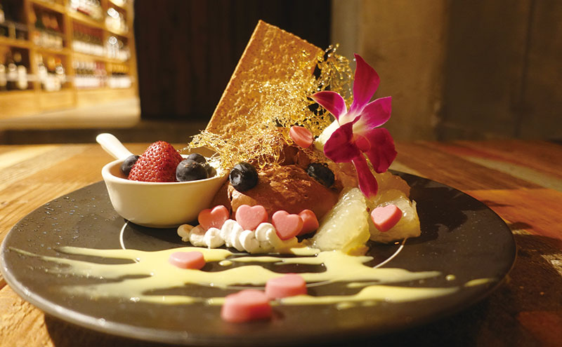デザートがまた芸術的で、チョコレートムースはとにかく綺麗に賑やかに飾られ、まるで記念日プレートみたい。