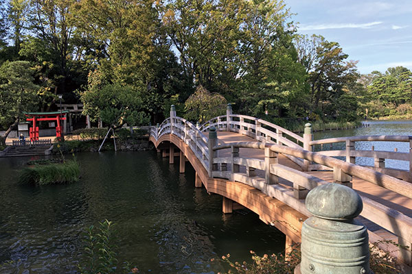 「池月橋」池の景観を風情豊かにするヒノキの三連太鼓橋。毎年5月の満月に近い夜に横笛の演奏会が開かれ、幻想的な世界観が生まれます。