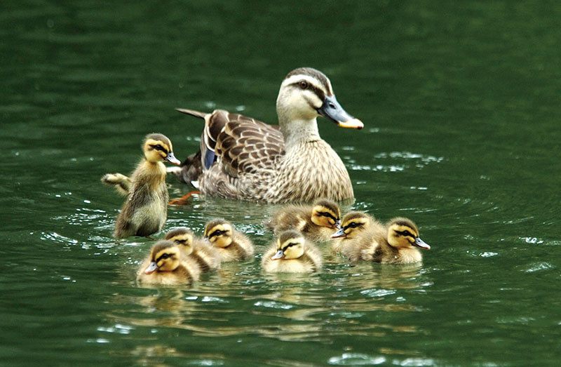 通年で見られる「カルガモの親子」は、稀に親子の団体で陸地に上がってくることも。