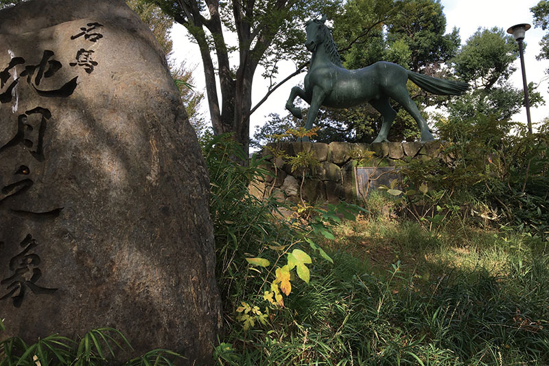 さらに池沿いに歩いて池月橋を渡ると、平安時代に源頼朝がこの場所で出会い、平家打倒に出陣したという愛馬「池月」の像がお出迎え。今にも駆け出しそうな姿勢で池を見つめているのは昔のまま。