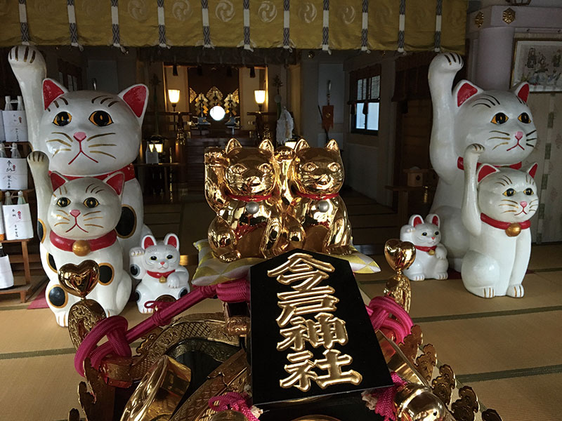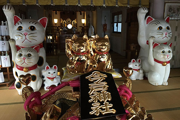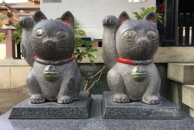 本殿横にある招き猫。スマホの待受けにするとご利益があるのだとか。左の黒い模様がある猫がオスですよ。