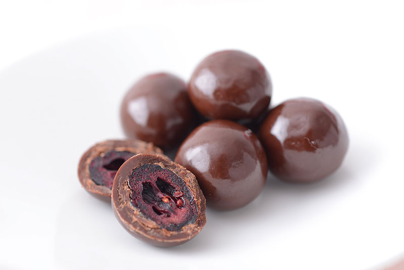 特別製法によって、水分量を多く残した「半熟ドライフルーツ」は、クランベリー本来の酸味とジューシーさをふんだんに楽しめる仕上がり。酸味と甘みのバランスが絶妙なクランベリーが、チョコレートの甘さを自然と際立たせてくれています。