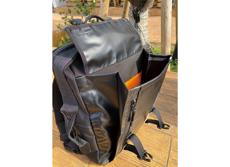 大きく開くフロントポケットの横には、29cm×18cmまでのタブレットなどを収納できるサイドポケットの他、充電ポケットやカードポケット、書類ポケットまでも完備。