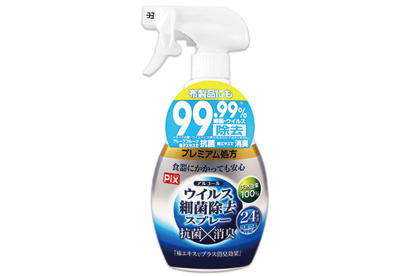 ソファやカーテンの除菌はもちろん、お風呂や洗面所、キッチンの抗菌にも効果が期待できる「Pix アルコール ウイルス細菌除去スプレー」。