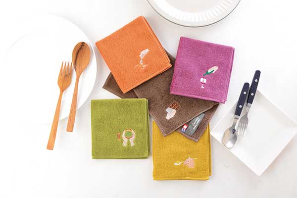 食べるモノの色に合わせて染めた色合いはリアルで美しく、今治タオルブランドの認証マーク入り。ネーミングも微笑ましくて、一緒に食事をするのが楽しみに♪