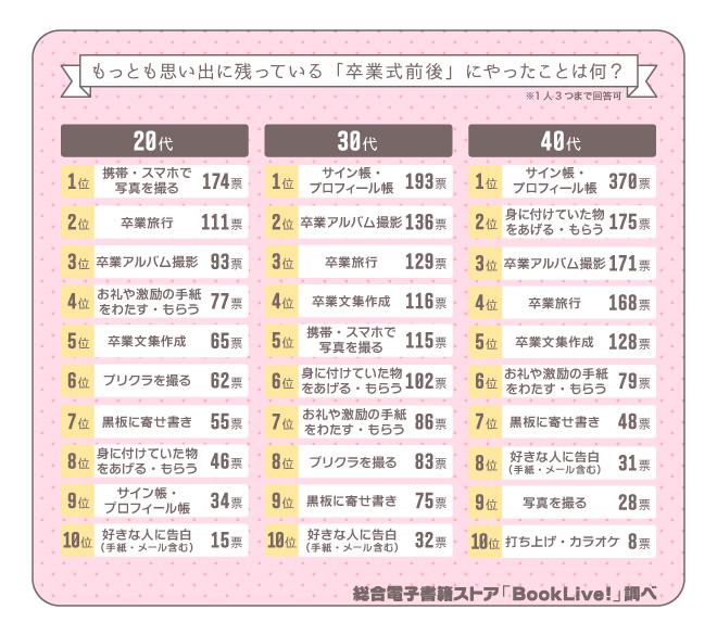 30代・40代は共に「サイン帳・プロフィール帳」が1位にランクイン。連絡先やイラスト、メッセージを書いたり、プリクラを貼ったり…。当時の卒業シーズンでは定番中の定番だったようです。