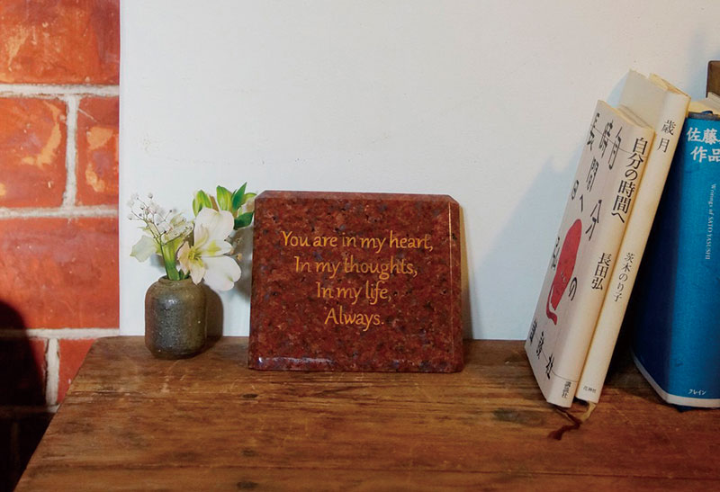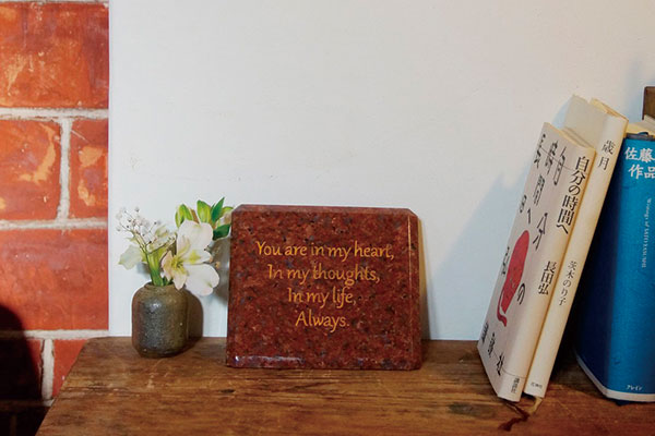 大切だった家族や大好きだったペットへの言葉を文字に刻んで、写真やお花の小物とともにリビングに置いて手を合わせたり、思い出したりできる空間がカタチ作れます。