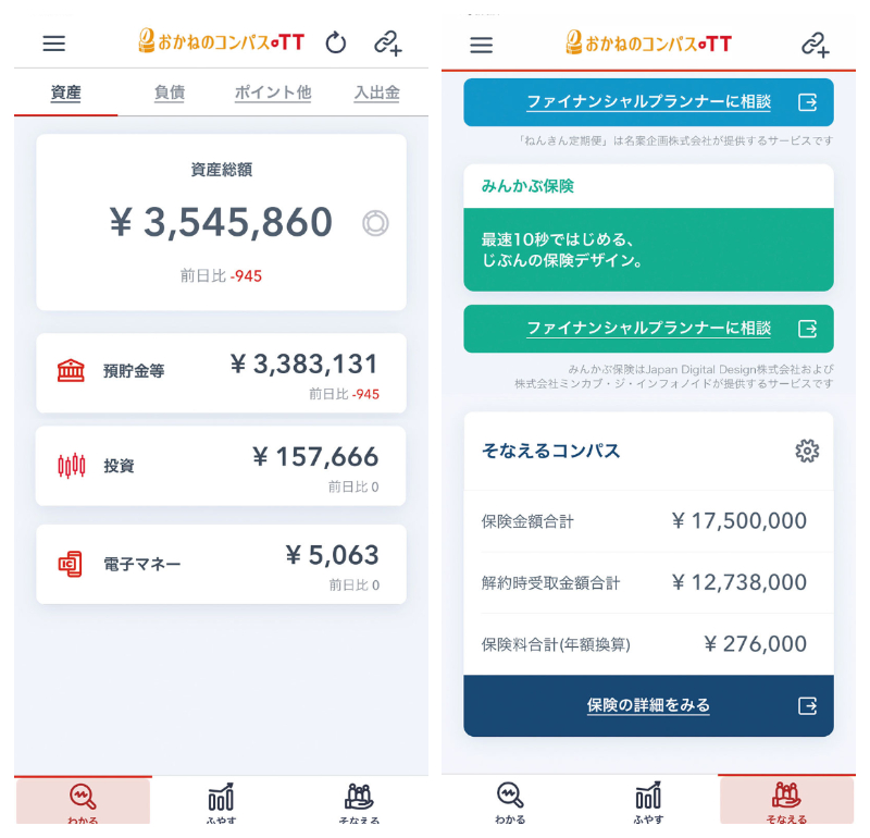金融機関の口座やカード、ポイント、マイルだけでなく、保険や年金まで一括管理できる資産管理アプリ「おかねのコンパス」と自分や家族が加入している保険を一括管理できるアプリ「そなえるコンパス」を連動して使うことで、生命保険や損害保険の契約内容まで一元管理できます。