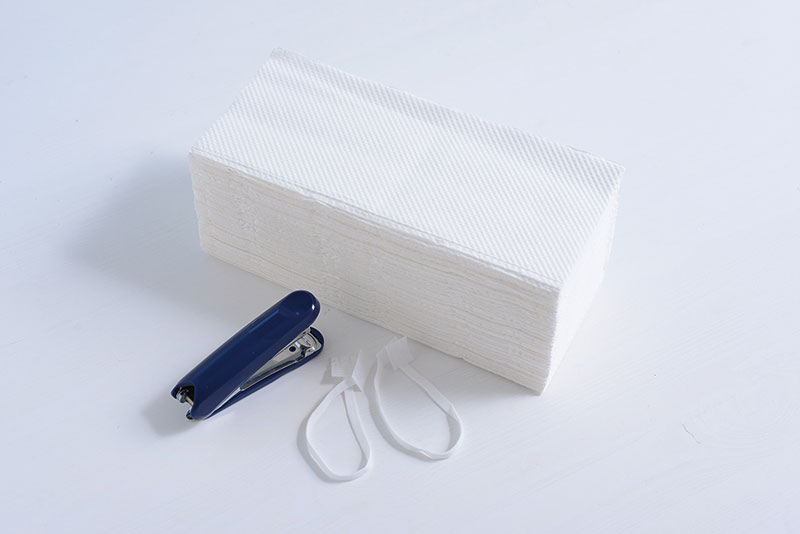 キッチンペーパーの左右にホッチキスで使用済みマスクのゴムを止めたら出来上がり。