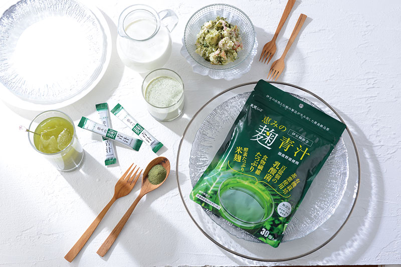 「日本の恵みを生かす」をコンセプトに開発された「恵みの麹青汁」には、自然豊かな伊豆・修善寺で育った大麦若葉とケールに、国産米100%から生まれた米麹や、コクとまろやかなうまみを引き出す海洋深層水から製塩した天然塩の栄養がたっぷり詰まっています。