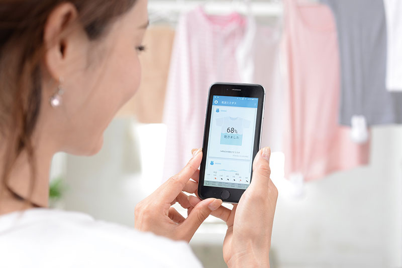 乾いた洗濯物をベストなタイミングで取り込むためにも、洗濯乾燥IoTセンサ「乾送ミミダス(R)」がおすすめ。